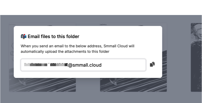 Any files sent to the folder address from any email will be automatically uploaded. You can use the folder address in the `To` , `CC` , or `BCC` fields and Smmall Cloud will upload the attachments. In the case of a long email thread, Smmall Cloud will automatically discard duplicates.