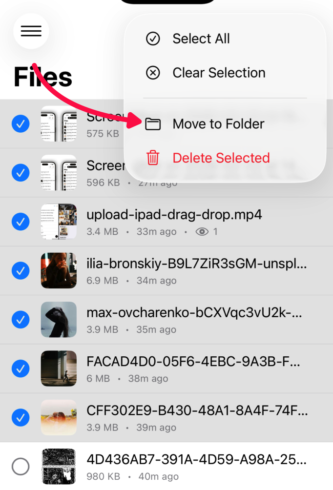 > **Tip:** You can drag and drop files between folders. Just long-press a file to pick it up, then drop it onto a folder in the list. You can even drag files from the Files tab and drop them onto a folder in the sidebar.